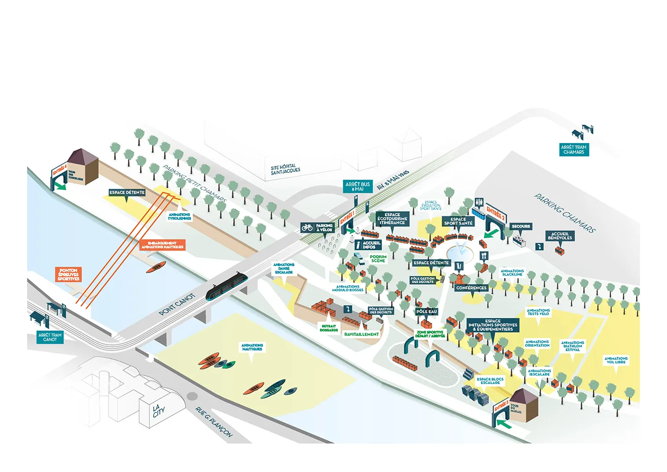 Rapide et agréable pour arriver en toute quiétude au festival. Parking à vélos disponible devant l’entrée principale.